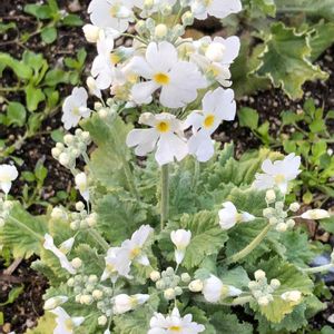 白い粉たっぷりのプリムラマラコイデスです。 白い粉が萼や花序にふりかかったたようなサクラソウ(プリムラマラコイデス) 化粧桜とも言われます。 人によってはこの粉でかぶれることがありますので要注意。 手入れの際はゴム手袋をすると良いでしょう。