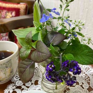 こんばんは🌠 お庭で摘んだ花と💐 お茶時間☕️ 珈琲とかりんとう饅頭は いかがですか? いただき物ですが…なんてね😉 昨日のホッと一息…な時間でした😋