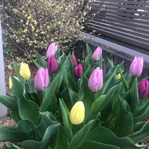 ミニ花壇にチューリップが咲き出しました。 後ろのヒュウガミズキはそろそろ終わります。