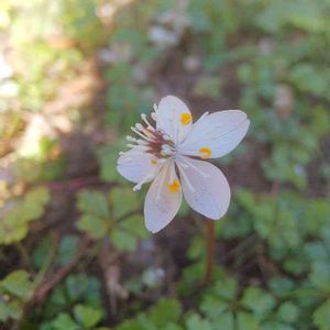 バイカオウレン(梅花黄蓮) 別名: ゴカヨウオウレン(五加葉黄蓮) キンポウゲ科 花弁は黄色い小さな部分で、花弁に見える白い部分は萼片。 茎の高さは5〜15cm。 花の直径は12〜18mm。 花弁と萼片は、それぞれ5個(キンポウゲ科の花では、萼片や花弁の数の変異はよくあるようです) 花は斜め上向きに咲きます。 花茎の色は褐色 黄色い花弁の先端部は丸く、浅い杯状です。 花の中央部の緑色の部分は花柱で、横に紫色の線が1本あり、先端部は横を向く程度に湾曲します。 花糸、葯、花粉は白色です。 昨年セリバオウレンを投稿しましたが、それはセリの葉に似ていることから。。 で、今回じゃぁバイカオウレンは❓ ➡️ この丸みを帯びて幅の広い萼片が梅の花を思い起こさせることが「梅花」の名の由来のようです。 この花は山野草の庭園で植木鉢に植わっていました。この可愛いお花を自然の中で見つけたいですね〜🥰 どこに咲いてるのかなぁ🧐