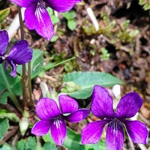 ヒメスミレ だと思うf(^_^) 葉や花柄が根もとから出ており、張り出した葉の鋸歯が目立つので… ま、庭だから普通種しか生えないだろうけれど、スミレは難しいなぁ🤷 美しく青き土曜🏷️