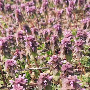 姫踊子草(ヒメオドリコソウ) シソ科オドリコソウ属の2年草。ヨーロッパ原産で、1893年に東京駒場で発見された帰化植物。今では日本各地の道端、空き地、河川敷など日当たりの良い場所に群生する。多くは秋に芽生え越冬してから成長するが、春以降芽生えることもある。葉は重ならないように生える。新しい葉が生えるときは下の葉を陰にしない位置に出る。下の葉ほど葉柄は長く面積が大きく、すべての葉に太陽の光が当たる。葉は花時には暗紫色で、やがて緑色になる。花期は3〜5月。花は淡紫色、シソ科特有の唇形花で上唇と下唇がある。上唇に沿って雄しべがあり、花粉はオレンジ色。下唇の一部が前に突き出て昆虫の着陸場になり、蜜のありかを知らせる濃紅紫色の蜜標がある。種子にはエライオソームがついていてアリが運ぶ。 名前は、踊子草(オドリコソウ)に似ていて小さいため姫が付いた。オドリコソウは花の形を笠をかぶった踊り子に見立ててついた名前。 出典『雑草のはなし』『都会の草花図鑑』