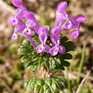 姫踊子草(ヒメオドリコソウ) シソ科オドリコソウ属の2年草。1893年に東京駒場で発見されたヨーロッパ原産の帰化植物。今では日本各地の道端、空き地、河川敷など日当たりの良い場所に群生する。多くは秋に芽生え越冬してから成長するが、春以降芽生えることもある。葉は重ならないように生える。新しい葉が生えるときは下の葉を陰にしない位置に出る。下の葉ほど葉柄は長く面積が大きく、すべての葉に太陽の光が当たる。葉は花時には暗紫色で、やがて緑色になる。花期は春だがほぼ1年中咲く。花は淡紫色、シソ科特有の唇形花で上唇と下唇がある。上唇に沿って雄しべがあり、花粉はオレンジ色。下唇の一部が前に突き出て昆虫の着陸場になり、蜜のありかを知らせる濃紅紫色の蜜標がある。種子にはエライオソームがついていてアリが運ぶ。 名前は、踊子草(オドリコソウ)に似ていて小さいため姫が付いた。踊子草は花の形を笠をかぶった踊り子に見立ててついた名前。 出典『雑草のはなし』『都会の草花図鑑』