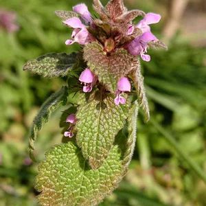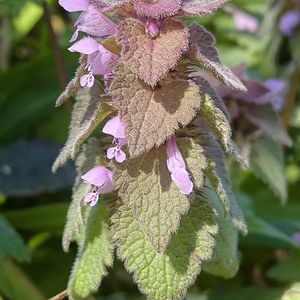 姫踊子草(ヒメオドリコソウ) シソ科オドリコソウ属の2年草。1893年に東京駒場で発見されたヨーロッパ原産の帰化植物。今では日本各地の道端、空き地、河川敷など日当たりの良い場所に群生する。多くは秋に芽生え越冬してから成長するが、春以降芽生えることもある。葉は重ならないように生える。新しい葉が生えるときは下の葉を陰にしない位置に出る。下の葉ほど葉柄は長く面積が大きく、すべての葉に太陽の光が当たる。葉は花時には暗紫色で、やがて緑色になる。花期は春とあるがほぼ1年中咲く。花は淡紫色、シソ科特有の唇形花で上唇と下唇がある。上唇に沿って雄しべがあり、花粉はオレンジ色。下唇の一部が前に突き出て昆虫の着陸場になり、蜜のありかを知らせる濃紅紫色の蜜標がある。種子にはエライオソームがついていてアリが運ぶ。 名前は、踊子草(オドリコソウ)に似ていて小さいため姫が付いた。踊子草は花の形を笠をかぶった踊り子に見立ててついた名前。 出典『雑草のはなし』『都会の草花図鑑』