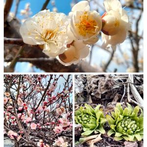 春の息吹です😊🌸🌱✨ 青空をバックに白梅の姉妹が輝いて見えました😄✨✨ ピンク色の梅も愛おしい😌🌸💕 双子のふきのとうも顔を出しましたよ😄🌱✨ 春は素敵😌🩷✨