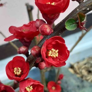 木瓜(ボケ)の花🌼 深紅のお花に惹き付けられました✨ 紅梅かと・・・ 無知でした😞💦 春を告げる花🌼葉よりも先に花を咲かせるとか😮 果実が瓜に似ていることから木瓜の名前が 2月4日、5日、17日の誕生花のようです🤗