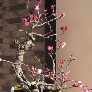 長寿梅盆栽🌸 冬枯れの姿に赤い花を見ながら梅見酒🍶 腹にしみます🎶
