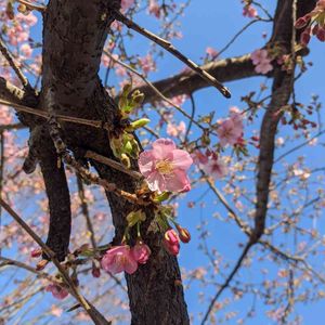 今日の…河津桜🌸 今朝の通勤途中 いつもの公園で… 一輪だけに注目してみました🧐 青空によく映えます🌸🎶