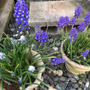 春の訪れ🌿 色の違うムスカリと、いつの間にか庭隅に咲いた 普通の3倍はありそうなジャンボムスカリです💜