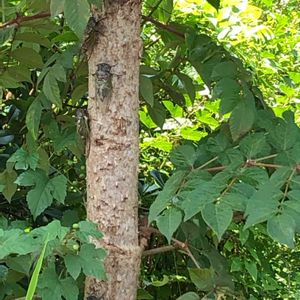 💦暑いですね💦 🎵クマゼミ音楽隊🎵 タラ(の芽の)木の幹に1、2、3、4、5、6、7、、、、^_^👏🏻 キチンと並んで🎵大🎵合🎵唱🥳🎼 指揮者は誰?声?を合わせて鳴いてます! 側を通ると一斉に飛び立ってまた舞い戻る :棘棘ですがこの幹の樹液お気に入り?