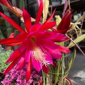 クジャクサボテンの最初の花が咲きました。花芽はあと7つあります。楽しみですね。