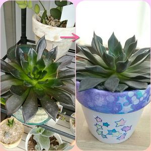 こんにちは👋😃 涼しくなったと思ったらまた暑いです💦 1月にお迎えした我が家のアフィニス💗 小豆缶でリメイクした鉢に植えたのですがどんどん成長して鉢からはみ出してたのでやっと植え替えてあげました🎶 リサイクルショップで50円でゲットした素焼き鉢をデコパージュ🎶 皆さんに比べたら全然大したことないですが私にしては可愛く出来たかな😅 自己満足です(笑)🈵😃✨ 葉挿しもいっぱい発根しました🌱🌱🌱🌱🌱🌱
