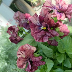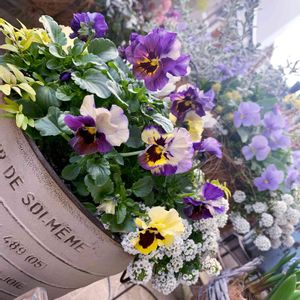 手前は園芸店のノーブランドビオラ➰このお色に一目惚れ💓濃い紫の絵になるスミレミュールと一緒にお迎えしました。 さてさてどんな寄植にしようかな➰