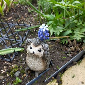 なぜかハリネズミさんの上に ムスカリの花がw ハリネズミさん 困ってます