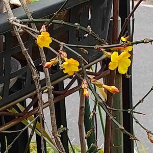 この花は梅に似た黄色い花を咲かせることから黄梅と呼ばれます。 また早春にパッと明るく咲くのでゲイシュンカ(迎春花)の別名もあります。 ジャスミンの仲間ですが、香りは ありません。 耐寒性もあり丈夫な樹木なので、剪定以外はほぼ放任のままで育ちます。 中国北部・中部原産。 モクセイ科ソケイ属の半蔓性落葉低木。