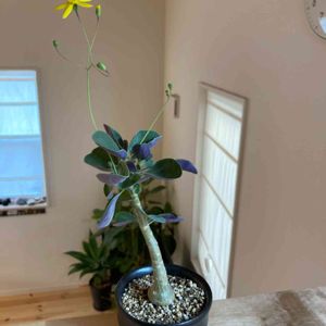 【オトンナ トリプリネルビア】 真上から塊根行方不明。 てっぺんまで30センチくらいかな? 来た頃と別物の装いで開花しました。