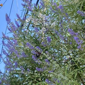 実家のセイヨウニンジンボク(西洋人参木)です。 成長が早く、植えて7〜8年で樹高は4mぐらい、冬季に強剪定しても夏には大きく枝を張ります。スミレ色と白の2本並んで咲いています。 家の中でも楽しめるかと花瓶に挿してみましたが水揚げは最悪、また漢方薬のような独特な香りもします。 セイヨウニンジンボクは、夏空を背景に咲いているのを眺めるのが一番かな。