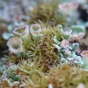 カングミの根元に生えてるジョウゴゴケ 可愛いので増やしたいです でもコケじゃなくて地衣類の仲間です 同定も難しいらしいのでとりあえずジョウゴゴケです