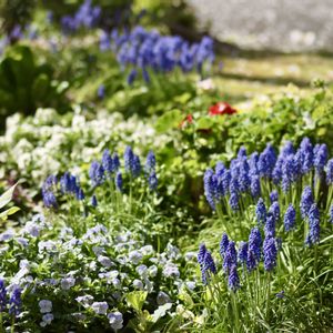 桜の下の花壇ではムスカリが満開です💙🎶😊 スーパーアリッサムも負けていません♡︎ᵎᵎᵎ♡̷︎♡⃜︎♡⃡︎ どこまで広がるかな😅 ラナンキュラスラックス も咲き出しました💛🎶