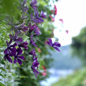 クレマチス アフロディーテエレガフミナ💜 一気に咲いてきました🎶 いいお色ですね〜ヽ(*´∀︎`)ノ♡︎ᵎᵎᵎ 海と岬が見える散歩道沿いのフェンスにからませてます(^_−)−☆