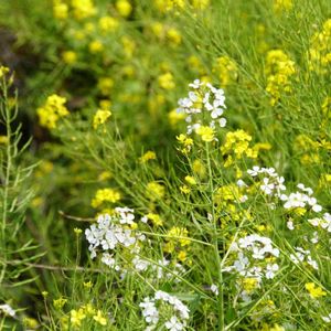 菜の花と白い花(´-`).。oO 黄色い菜の花の中に白い花が綺麗に咲いてました。 セイヨウノダイコンの花かなあ(・・;