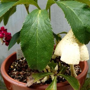 クリスマスローズの鉢にキノコ生えてるー😭💦