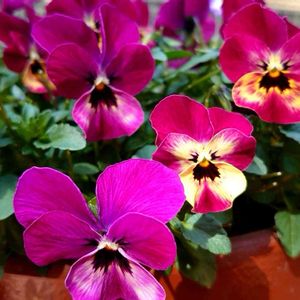 八号鉢に3株で植えたビオラ✨ 明るい色が元気になります♪