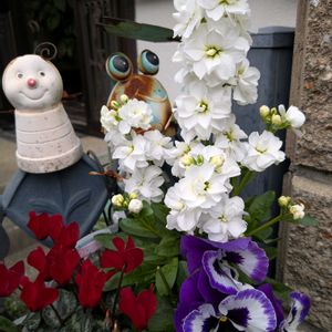 寄せ植え 八重ストック、葉牡丹、アリッサム、パンジー 西洋ヒイラギ 柊.ヒイラギの花🤍🌲