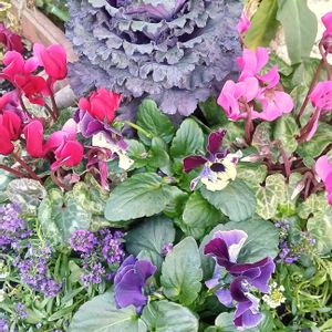 冬は置場所も狭くなるので寄せ植えにしてみました カラーリーフ ガーデンシクラメン 葉牡丹 ビオラうみももか ダリア球根保存の為 お花の部分をカットしました💗
