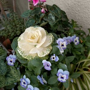 寄せ植え その② このポットは庭に置きます ・ブラキカムブラスコバイオレット ・ネメシアクリームパイ ・ゴールデンレモンタイム ・葉牡丹 萌花マーブル