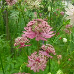 🌺アストランティア🌺 セリ科 星のような形をした花を咲かせる多年草。 花びらに見える部分は総苞で、その中心にたくさんの小花が集まって咲いています。花びらのように見える部分は総苞で、中心に小花が多数集まる。 半球状に盛り上がるように群れて咲きます。 雌しべが飛び出て目立つのも特徴。 アストランティアの花言葉は「愛の渇き」「知性」 ~十勝 紫竹ガーデン