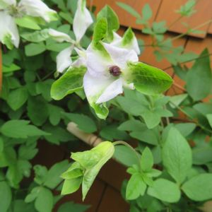 💚クレマチス アルバ ラグジュリアンス💚 真っ白色の花弁に、弁先がグリーンがかる清楚な花色。 こんなクレマチスもあるんですね😲 咲く状態により淡い紫色が入りグリーンがかり方が異なるそうです。 伸びたつるの節々に横向きの花をつけます。