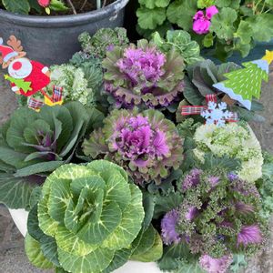 葉牡丹だけのセンスのかけらも無い寄せ植え😂😂 植えてから約1か月。 モリモリして来ましたが、フォローさんのpicでも色がぼんやりして来たとの事。 中心部が特に薄くなってしまいました。 何故なんでしょう☹️☹️ 他の花達の入る隙間がないので、とりあえずクリスマス🎄感だけ。 お正月🎍は、千両でも入れようかな。