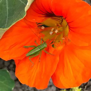 おはようございます😃 ナスタチウムにお客様が😅💦 この子は、悪い子なのでしょうか? 良い子なのでしょうか? この色、やっぱり元気になる色だね🧡 とっても華やかだわ🎵