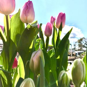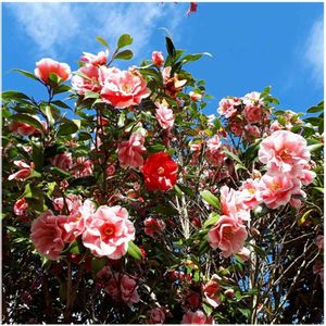 つるつるピンク 青空 バンザーイ! ちょっと花咲すぎ( *´︶`*)