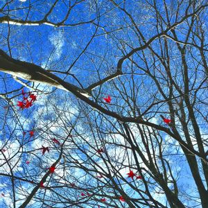 晦日の青空 真っ赤に紅葉したもみじ🍁が数枚 まだ木にしがみついて年末を迎えようと しています