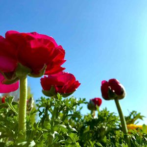 雲ひとつない青空 真っ赤なラナンキュラスが映えます✨
