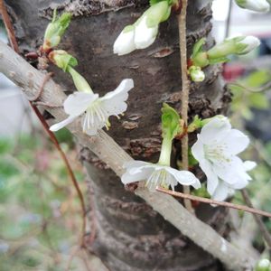 我が家の白い桜 胴吹きの枝から幹に付いて咲いている 昨日の暖かさで1輪咲いたけれど、今日の寒い曇天で開花は進まない。 道東は雪が降っている。これからこちらにも降るようだけれど… 咲き始めた花たちが心配‼️