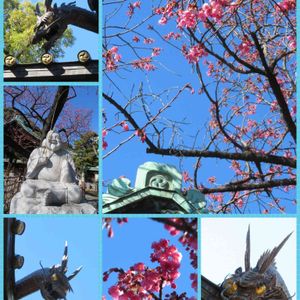 🌺寒緋桜🌺 龍繋がりでもうひとつ~😅 龍神(水神)を祀る神社として創建された荏原神社へぶらり~🚶♀️ かつては「品川の龍神様」と崇敬を集め、「品川貴船社」「貴布禰大明神」など称され、水の神(龍神)を祀る神社として崇敬を集めたそうです。 社殿の屋根から睨みをきかせる龍の姿が‼️ 御神木の寒緋桜が咲き始めました💕