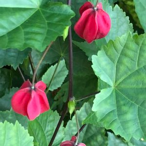 チロリアンランプがいっぱい咲いていました。 アオイ科アブロチン属 別名 ウキツリボク 蕾包む苞(ほう)が赤く 花は黄色い。