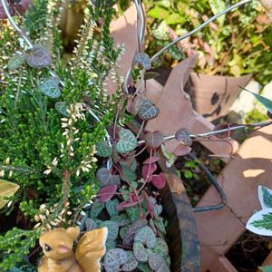 玄関にハートかづらも飾ってみたいい感じ💕💕 あれ〜寄せ植えの下のドラム汚れてたわ😂