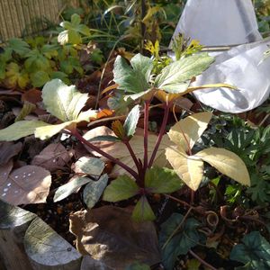 4.4℃🌅/14℃☁️→🌧️ クリスマスローズ ステルニー ネオゴールデンリーフ 一株でいろんな葉っぱが楽しめて🟢🟡🔵 冬枯れした花壇のさみしさが和らぎます🍀☘️ (おまけ5️⃣) 今年はそのままにしようと思っていた花壇のラックスですが、やっぱり不織布巻きしました⛺️❄