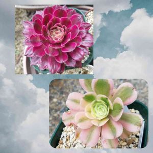 『24日は錦の日~~🎵』😁 皆さんの投稿を見て…👀💕 私も参加させて下さい~❗💖🙏 ✨アエオニウム属~ ⬆️ マリド錦 ⬇️ 艶日傘 どちらもまだキレイ~💗 これから小さくなってしまうかな〰️😓