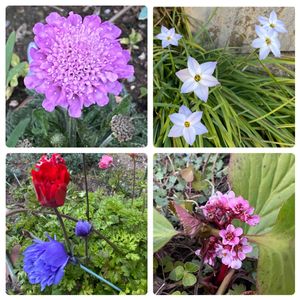 だんだん曇ってきました☁️ 左上 冬越しスカビオサ 左下 地植えのアネモネ 右上 ハナニラ 右下 ヒマラヤ雪の下 小さな庭も着実に春めいてきています💕