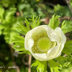 こんばんは🤗 去年の10月に球根を植え付けたアネモネの凜々花さん🌼 やっと初花が咲きました~(⁎˃ᴗ˂⁎)ワーイ♪ 去年はパステルピンクの花色でしたけど、今年は緑がかった白いお花になりました😉 🏷️八重咲きアネモネ凜々花 から去年のお花が見られます(*^^)v 写真だと分かりづらいかもですけど、うっすらとピンクの絞り模様が入っているんです😃💕 薄化粧をしているようなべっぴんさんです(* ´ ▽ ` *)