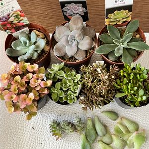 おはようございます😃 昨日多肉ちまちま屋さんでゲットした子達です😆 自分で作った寄せ植えは、何故か?ジャングルになってしまうので、作って頂いた寄せ植えさんは上手く育てられるか?購入してみました🤭 そして、可愛いセダムちゃんをたくさん頂いちゃいました✌️😆✌️ ちまちま屋さんありがとうございました❤️