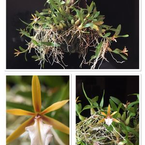 今日は天気が悪いので室内で植物管理です。 開花しました。 昨年8月に半額セールで入手したらん科のポリブルボンです。 当初から開花は無理かなとバルブや葉姿だけを楽しんでたのですが、花も見られてラッキーです。😊