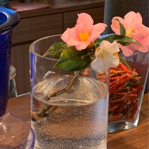 おはようございます😃 花瓶に入った花を撮ることはほとんどありません。😅 行きつけのお店です。 偶然にも、初めて見る椿の花が飾られていました。 お客さんが持ってきてくれたそうです。 白侘助と淡いピンク、一重の侘助椿です。 筒咲きやラッパ咲きよりも花びらの開き方が大きいです。 色はよく見る紅色の侘助よりも淡い桃色です。😊 花の中央部まで、同じ色です。 淡侘助という品種の花のようです。🤔 近くなら木で咲いている状態を見たいものです。😅