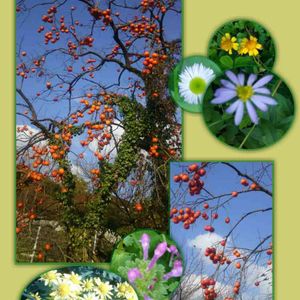 秋彩 大きな柿の木 青空にオレンジ色が映える 綺麗だ 渋柿なので鳥達も遠慮してるのだろう 気持ちいい 久しぶりに山里を3人で歩いた 🌱島寒菊 🌱ヒメジオン🌱ヨメナ 🌱仏の座🌱野路菊