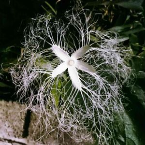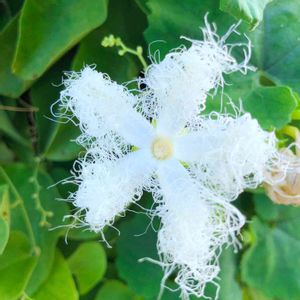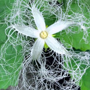 道端の植え込みに白い花。 直径4、5センチ ネットが巻きついたような花弁が とっても個性的で… どうしてこんな形をしてるのかな?って 考えていたら楽しくて 名前がわからないことを忘れてました(笑) (๑˃̵ᴗ˂̵)君の名は! 回答をいただけました【カラスウリの花】 宇宙と交信してそう…⚡️ಠ_ಠ